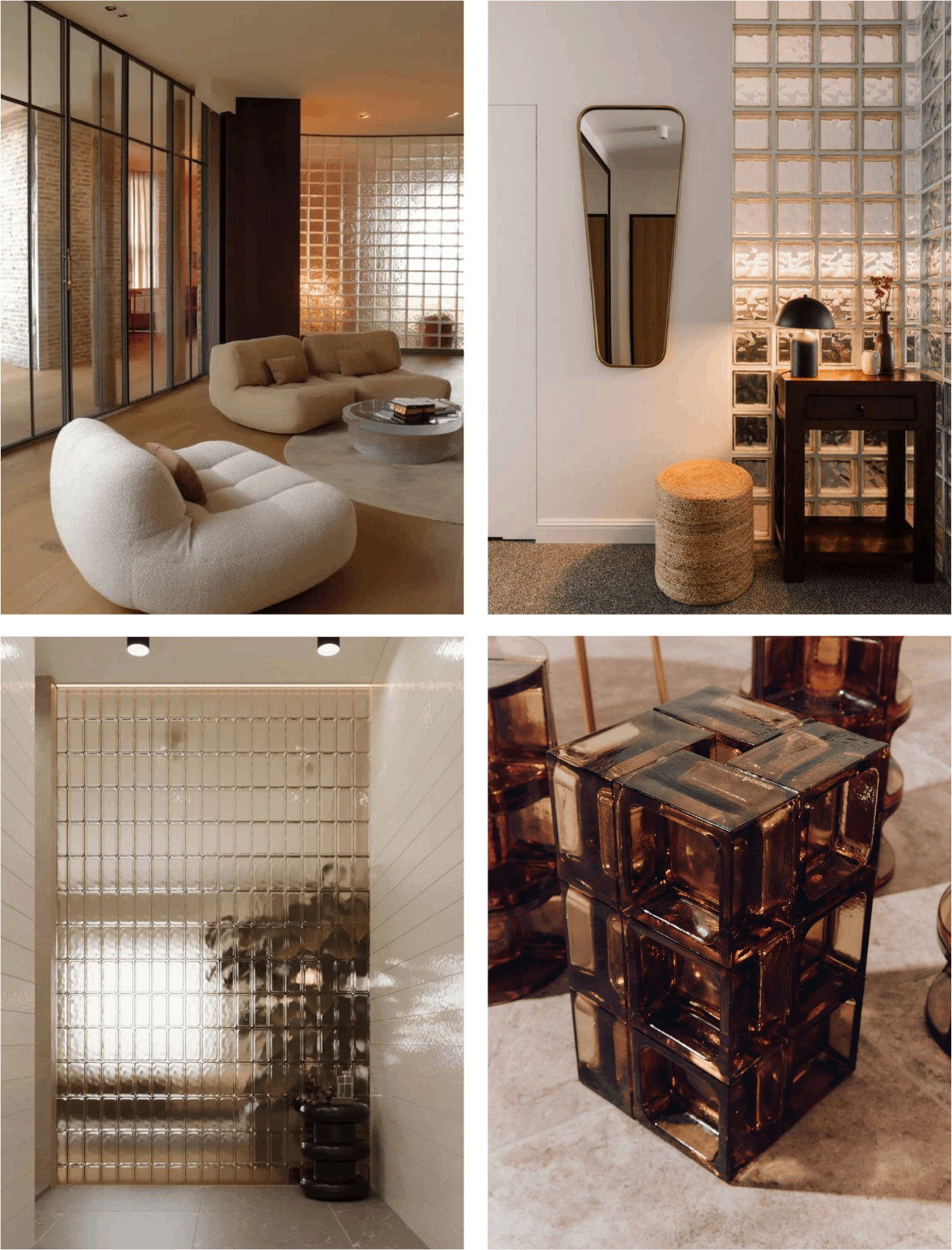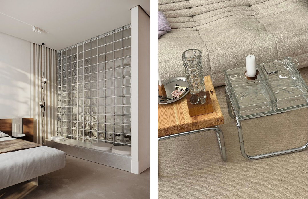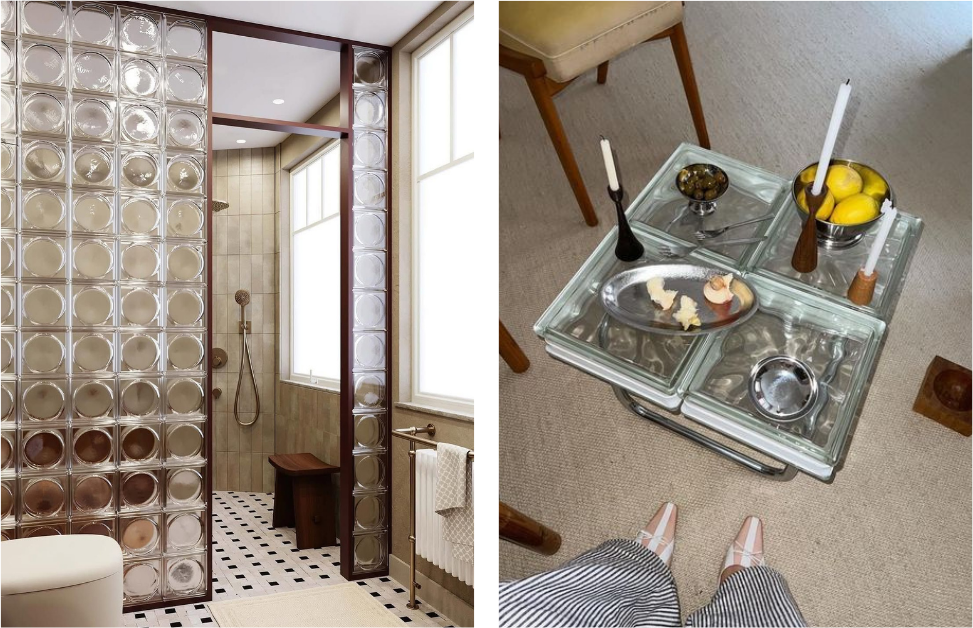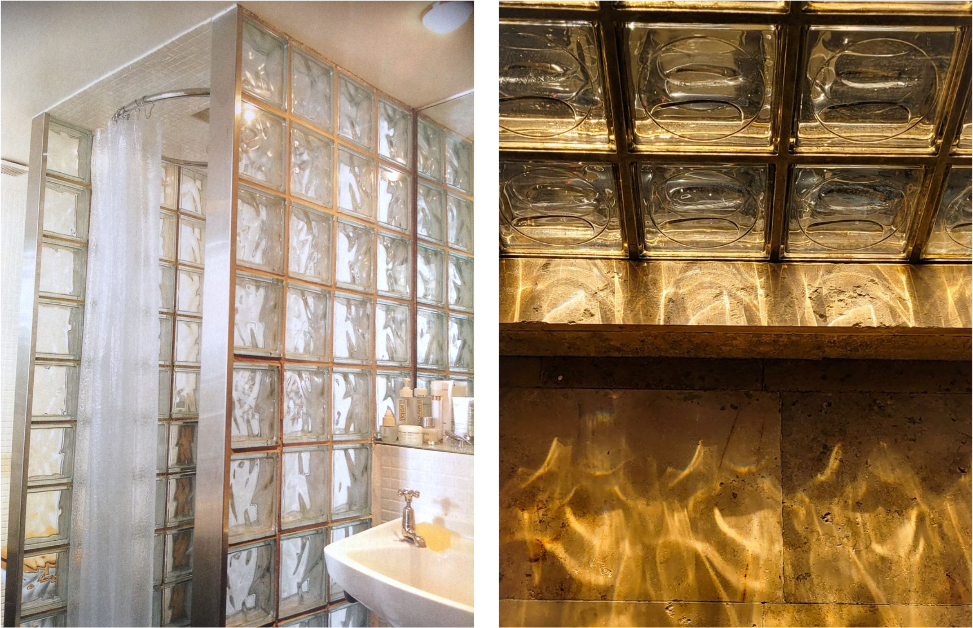 In recent years, both glass bricks and glass blocks have been reassessed and reintroduced with greater intentionality. Contemporary architects and designers are drawn to their nostalgic appeal and atmospheric qualities, using them to create moody, light-filled spaces. Today they appear in walls, skylights and pavement lights, as well as in interior applications such as showers, partitions, furniture and even entire kitchens, and increasingly in refined exterior façades – each material chosen for the specific qualities its construction affords.